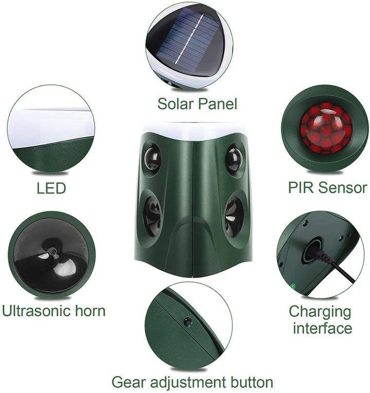 :المميزات-.مبيد للحيوانات-.مسافة الاستشعار: 1-10 م-.مصدر الطاقة: الطاقة الشمسية أو يو اس بي-.ضد الماء-.زاوية 360 درجة-.شحن يو اس بي-.AA البطارية: 800 مللي أمبير-.اللون: أخضر-775282