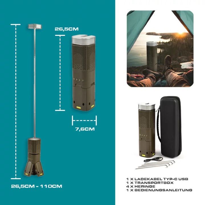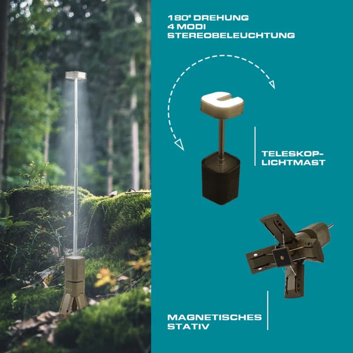 :المميزات-.مصباح خارجي قابل لتعديل الارتفاع-.عمود تلسكوبي-.مكبر صوت بلوتوث مدمج-.ارتفاع يصل إلى 110 سم-.أربعة أوضاع إضاءة مختلفة: أبيض دافئ، أبيض بارد، محيطي مع تغيير اللون-.حامل بمغناطيس قوي-.أربعة أزرار منفصلة للتحكم في الإضاءة...