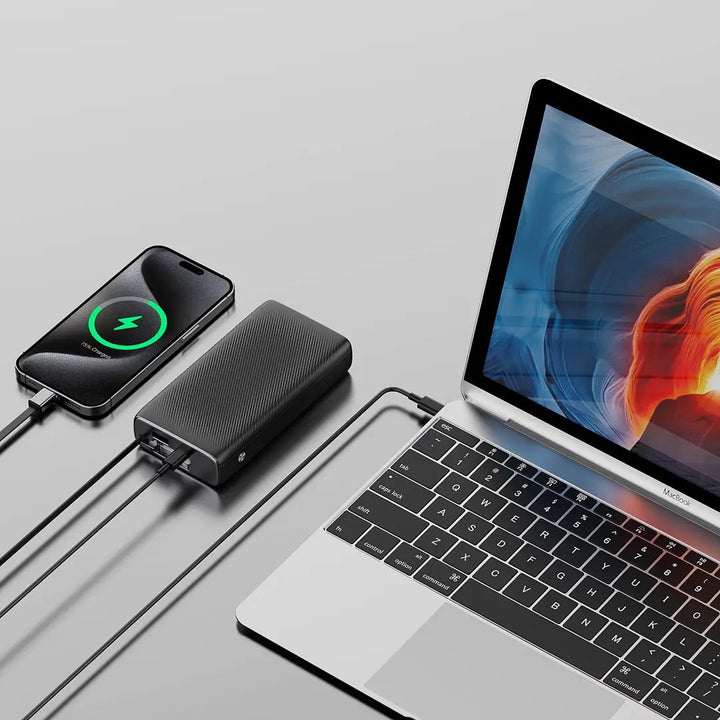 .سعة الشاحن: 20000 مللي أمبير-.تقنية الشحن: شحن سريع-.منفذ الشحن: منفذ تايب سي بقوة 35 واط ومنفذ يو اس بي بقوة 22.5 واط-.كيبل تايب سي قابل للسحب 70 سم-.الطاقة القصوى 35 واط-.LED...